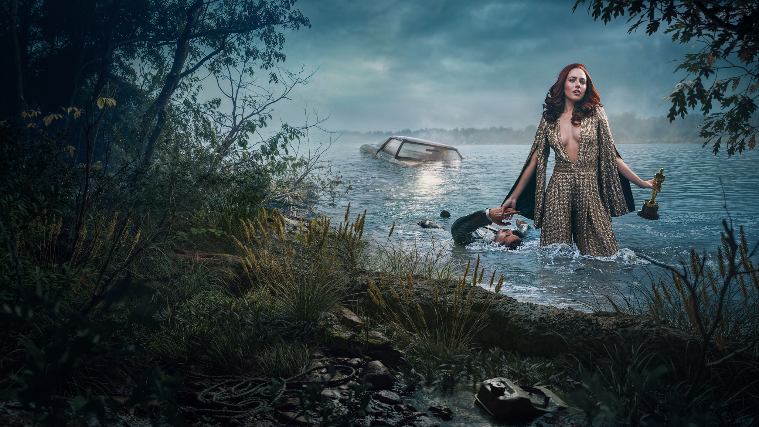 The image had been living in my head for a while: an award-winning actress on Oscar night, wading through a river in full gown, rescuing her driver from a sinking car wreck, Oscar still in hand. Composed, determined, completely unfazed. The kind of woman who wins the award and saves the driver and never smudges her lipstick. That was the character. That was the world. All I needed was the right dress and the right woman to wear it.