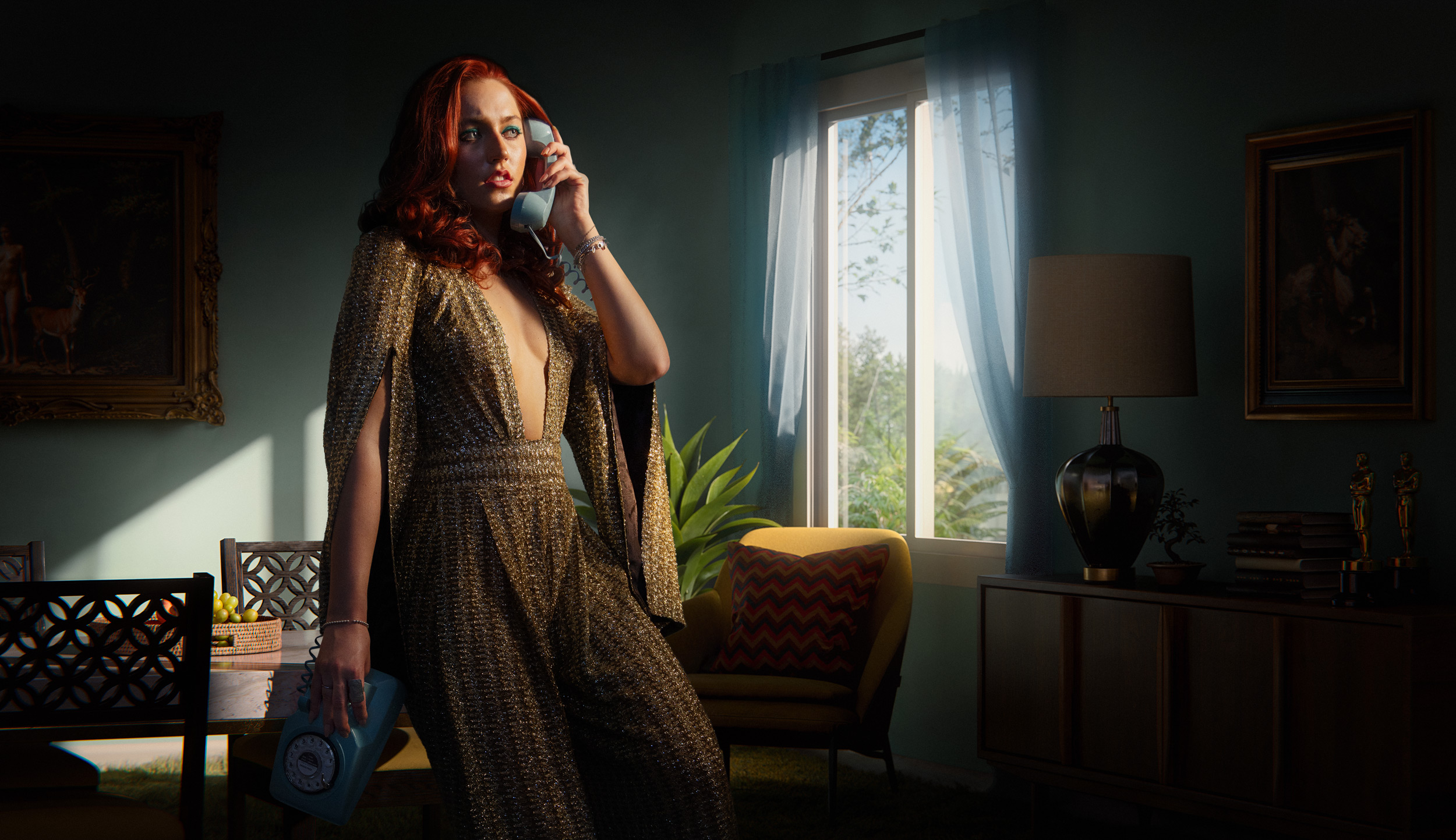 We had the wardrobe, the perfect subject, and a vintage telephone prop. Everything else would be CGI, another example of how the hybrid method compresses production without compromising the result. I also sourced a wig in advance so we could move between scenes without needing a hair stylist on set.