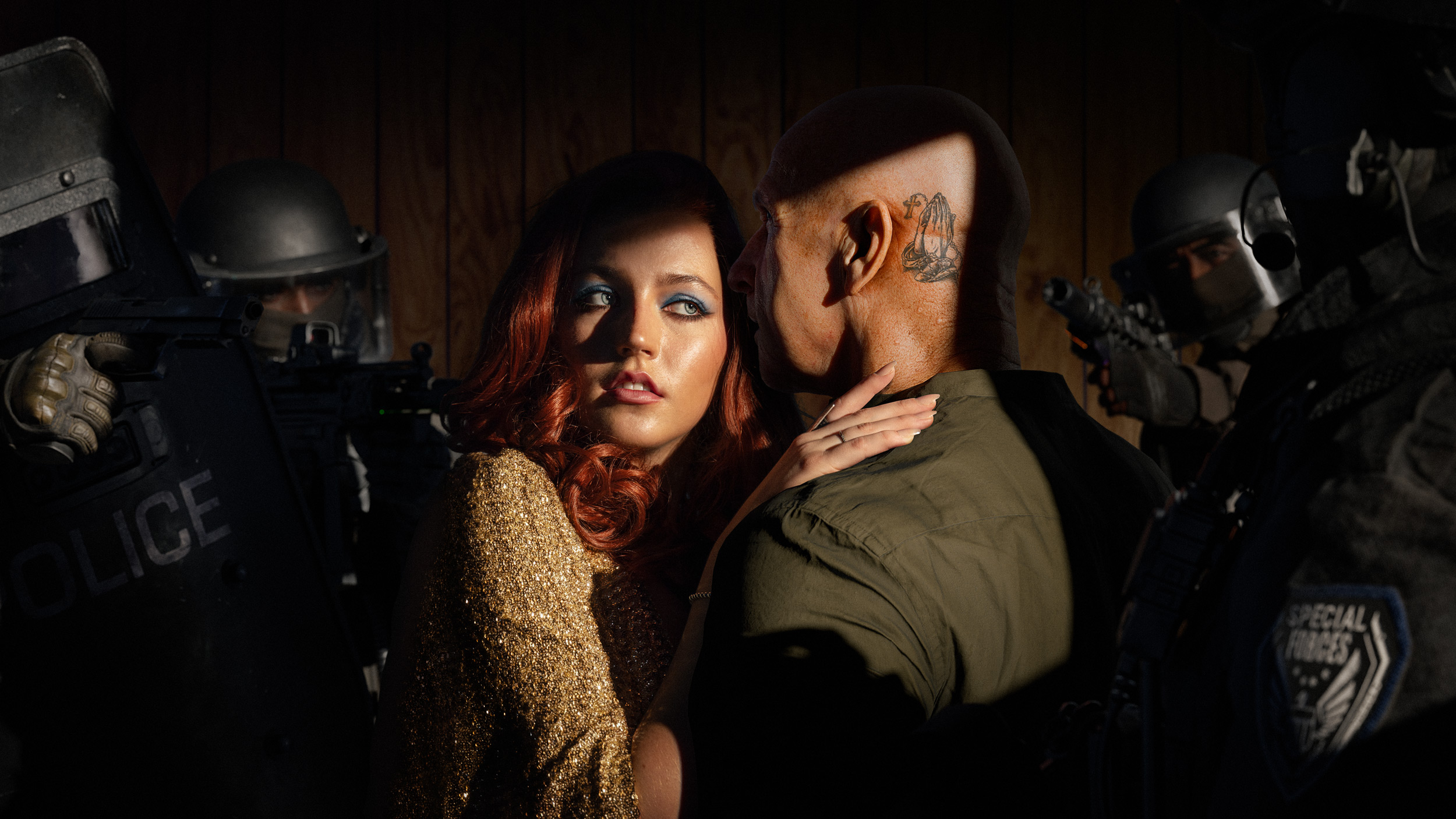Oscar-worthy wardrobe is not easy to come by on a personal project budget. The concept required something specific: a gown with the weight of Hollywood history behind it, glamorous enough to sell the fiction, cinematic enough to survive a river. Everything else, the river, the sinking car, the SWAT perimeter, the In and Out Burger, could be built in CGI. But it had to start with the dress.